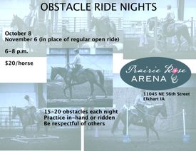 Coming to Prairie Rose this year - obstacle practice! Six nights total, starting in April. $20/horse. In-hand or ridden. Just be respectful of other people and horses, and don't hog an obstacle.
