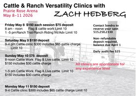 come to one, come to them all-- ranch riding, ranch trail, and cattle clinics with Zach Hedberg. Any experience level - if you can walk, trot and steer your horse, you're ready to try cattle. One-on-one with Zach and learn from others as they learn. Schooling show features on-the-spot, individual feed back from Zach. Contact Sondra at 515.250.2330 to reserve your spot. Non-refundable deposit required to hold, balance due April 15 2026.